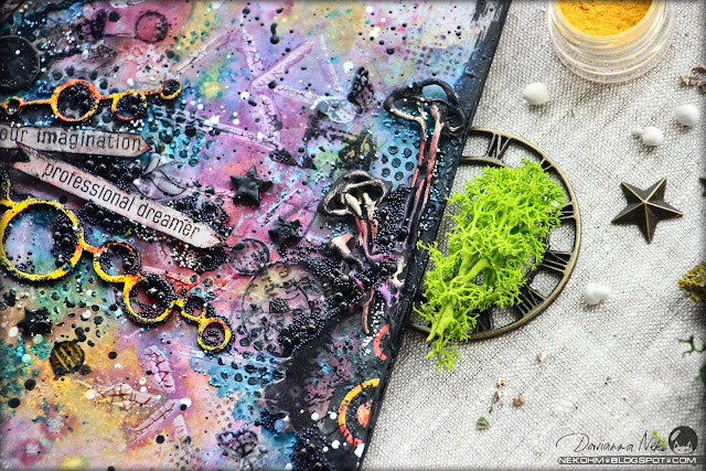 I also added my favorite transparent plastic elements! They give work a lot of details and do not overload it. Stamps "Don't forget to fly" with butterflies from Finnabair and stamps of leaves helped me to do this.